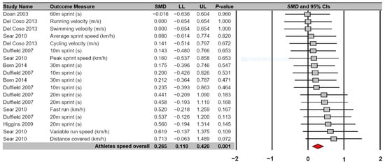 The effect of the compression garment on the speed for the whole-body suit. Abbreviations. SMD: standardized mean difference, LL: lower limit, UL: upper limit, CIs: confidence intervals, h: hour. A more positive size indicates increased speed performance. Note that gray square indicates individual effect size with 95% CI. Red diamond demonstrates overall effect size [17,37,44,47].