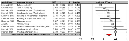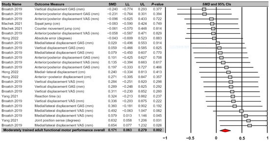 For speed, moderator variable analysis identified significant effects for athletes (18 comparisons from six studies; SMD = 0.265; 95% CI = 0.110 to 0.420; p = 0.001; I2 = 00.0%; Figure 2), and a funnel plot indicated potential asymmetry with two imputed values, and this bias was additionally observed in the Egger’s regression test (Egger’s β0 = 4.518 with p = 0.008; Supplementary Figure S4). However, no significant effects appear in moderately trained adults (two comparisons from two studies) and healthy adults (five comparisons from three studies) (Supplementary Table S4). For endurance, positive effects of compression garments were observed for moderately trained adults (11 comparisons from four studies; SMD = 0.219; 95% CI = 0.079 to 0.358; p = 0.002; I2 = 0.0%; Figure 3). A funnel plot indicated potential asymmetry with four imputed values, and this bias was additionally observed in the Egger’s regression test (Egger’s β0 = 5.064 with p = 0.021; Supplementary Figure S5). However, compression garments failed to improve endurance in athletes (20 comparisons from 10 studies), highly trained adults (two comparisons from two studies), and healthy adults (one comparison from one study) (Supplementary Table S4). For functional motor performance, the analysis revealed significant positive effects for moderately trained adults (25 comparisons from four studies; SMD = 0.171; 95% CI = 0.063 to 0.279; p = 0.002; I2 = 0.0%; Figure 4), and a funnel plot showed minimal publication bias, and this bias was additionally observed in the Egger’s regression test (Egger’s β0 = 16.019 with p = 0.0004; Supplementary Figure S6). However, no significant effects appeared in athletes (20 comparisons from six studies), highly trained adults (one comparison from one study), and healthy adults (12 comparisons from four studies) (Supplementary Table S4). For remaining power and strength, and sport-related performances, moderator variable analyses failed to report any significant effects depending on different participant types (Supplementary Table S4).