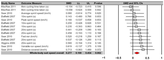 In addition, we found that whole-body suits were effective for improving speed performance, and lower-body suits enhanced endurance performances. Both upper and lower-body suits were effective for functional motor performances. These findings tentatively suggest that supporting upper and lower extremities with whole-body suits may be suitable for some exercise protocols required for speed-related motor functions because of the potential contributions of properties of upper and lower limbs to increasing speed performances such as sprint velocity [80,81]. Similarly, given that functional motor performance tasks in this meta-analysis consisted of either upper or lower limb movements, both upper- and lower-body suits might be effective. Not surprisingly, the findings on endurance performances indicated that lower-body suits may be an option whereas the effects of whole-body suits from a small sample size (i.e., four comparisons) were insignificant. Presumably, the included studies estimated endurance performances using running and cycling tasks requiring repetitive and continuous lower limb movements, so that wearing lower-body suits including (e.g., hip-thigh, calf-ankle, and knee joint sleeves) may provide physiological and biomechanical benefits for improving endurance capabilities.