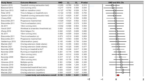 The effect of the compression garment on the endurance for moderately trained adults. Abbreviations. SMD: standardized mean difference, LL: lower limit, UL: upper limit, CIs: confidence intervals. A more positive size indicates enhanced endurance performance. Note that gray square indicates individual effect size with 95% CI. Red diamond demonstrates overall effect size [32,33,50,57].