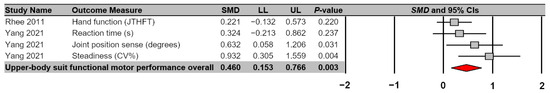 The effect of the compression garment on the functional motor performance for the upper-body suit. Abbreviations. SMD: standardized mean difference, LL: lower limit, UL: upper limit, CIs: confidence intervals, JTHFT: Jabsen Taylor hand function test, CV: coefficient of variance. A more positive size indicates improved functional motor performance. Note that gray square indicates individual effect size with 95% CI. Red diamond demonstrates overall effect size [19,59].