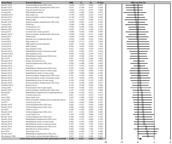 The effect of the compression garment on the functional motor performance for the lower-body suit. Abbreviations. SMD: standardized mean difference, LL: lower limit, UL: upper limit, CIs: confidence intervals, GAS: gastrocnemii muscles, VAS: vasti muscles, RMS: root mean square, ROM: Range of motion, rpm: revolution per minute, Hz: hertz. A more positive size indicates improved functional motor performance. Note that gray square indicates individual effect size with 95% CI. Red diamond demonstrates overall effect size [9,11,18,21,30,33,36,38,45,51,52,53,56,62].