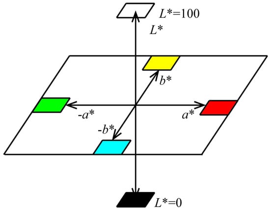 In the CIELAB coordinate system, L, a *, and b * values represent the brightness, red–green chroma, and yellow–green chroma of a color, respectively. The larger the L value is, the higher the brightness of the color. An L value of 0 is black, and 100 is white. The value of a is between −80 and 100. When a > 0, the color is red, and the larger the value of a is, the redder the color. When a < 0, it indicates that the color is green. The b value is also between −80 and 100, where b > 0 is yellow, and b < 0 is cyan. ∆E is the total color difference, and the calculation method is shown in Formula (1).