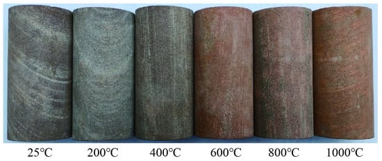 The appearance and morphology changes of sandstone samples before and after heating are shown in Figure 3. When the sample was not heated, the color was purple, the knocking sound was clear, and the surface was smooth. After heating to 200 °C, the color became slightly white, the knocking sound was crisp, and the surface was smooth. After heating to 400 °C, the color became slightly red, the knocking sound became turbid, and the surface was smooth. After heating at 600 °C, the overall color changed from purple to red, the knocking sound became turbid, and the surface was rougher than before. After heating to 800 °C, the red color was lighter than that at 600 °C, black matter appeared locally (it is speculated that this was the surface of dark minerals melting and precipitating), the knocking sound was turbid, the surface was rougher, and particles were difficult to rub down. After heating to 1000 °C, the red color was deeper than that at 800 °C, the black matter disappeared, the knocking sound was very muddy, the surface was very rough, and particles could be rubbed off.