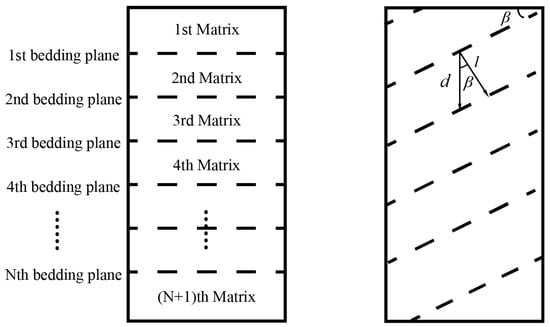 As shown in Figure 4, assuming that the matrix quantity of all rock samples and the horizontal thickness of each matrix were the same, the thickness of the matrix in the axial direction was also different for sandstones with different bedding dip angles. The relationship between the horizontal thickness of the matrix and the axial thickness of the matrix under different dip angles is shown in Formula (2):