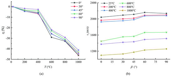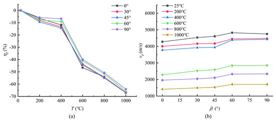 Figure 5b and Figure 6b show that at the same temperature level, the ultrasonic velocity of sandstone generally increased with the increasing bedding dip angle. When β = 60° and 90°, the ultrasonic velocity of sandstone was obviously higher than that of sandstone with other bedding dip angles. It can be seen from Figure 5a and Figure 6a that the wave velocity variation trend with temperature can be divided into two groups. When β = 0°, 30° and 45°, the ultrasonic velocity curve trend with temperature is similar, and when β = 60° and 90°, the wave velocity change curve is relatively similar because the distance of ultrasonic wave propagation in the matrix is relatively small in the sandstone with two bedding angles. When β = 0°, 30°, and 45°, it is obviously larger, and the ultrasonic velocity is faster.