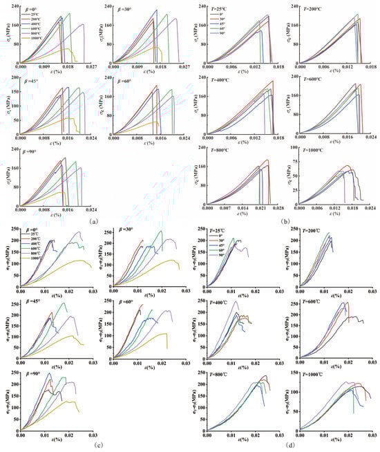 Figure 7b shows that the sandstone stress-strain curves at the same temperature level with different bedding dip angles are also different. When T = 25 °C, compared with other bedding dip angles, the stress of β = 45° sandstone decreased before reaching the peak value, indicating that the rock sample was partially damaged along the bedding plane before complete failure. When T = 200 °C, sandstones with all bedding dip angles showed typical plastic elastic stress-strain curves. When the rock sample reached the peak strength, obvious brittle failure occurred, and the stress rapidly decreased. The elasticity and strength of sandstone at β = 60° and 90° are obviously better than those of sandstone with other bedding dip angles. When T = 400 °C and 600 °C, the stress of β = 45°, 60°, and 90° sandstones decreased before the peak strength, indicating that the bedding direction of the rock sample was partially destroyed before reaching the peak stress, and the influence of the bedding angle was increased. When T = 800 °C and 1000 °C, the difference in sandstone stress-strain curves with different bedding angles becomes obvious, the porosity compaction stage, elastic stage, and crack development stage of the stress-strain curve of β = 0°, 30°, and 45° sandstone were relatively prolonged compared to sandstone at β = 60° and 90°, and the peak strain and peak strength of the sandstone decreased with the increasing dip angle.