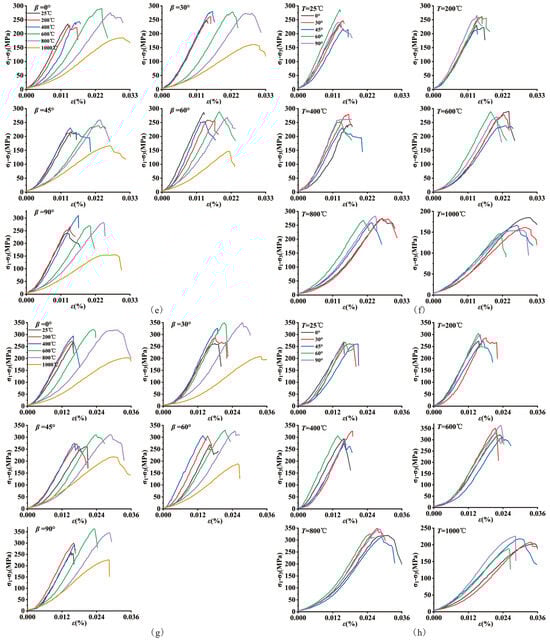 (a) Stress-strain curve of the rock sample at the same dip angle in the uniaxial compression test; (b) stress-strain curve of the rock sample at the same temperature in the uniaxial compression test; (c,e,g) stress-strain curves of rock samples at the same dip angle in the triaxial compression tests under confining pressure of 5–15 MPa; (d,f,h) stress-strain curves of rock samples at the same temperature in the triaxial compression tests under confining pressure of 5–15 MPa.