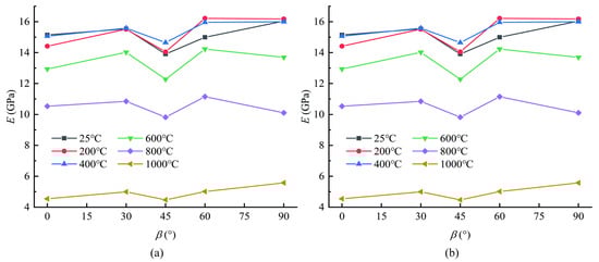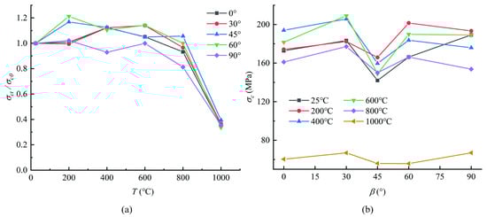 Compressive strength testing was conducted on high-temperature layered sandstone and the obtained parameters were normalized. The elastic modulus was calculated according to the stress-strain curve of the mechanical compression test for each sample. The average elastic modulus was used as the elastic modulus, that is, the slope of the nearly straight line (elastic stage) on the stress-strain curve of the sample. As shown in Figure 9a, the variation trend of the elastic modulus of sandstone with different bedding angles can also be divided into three cases: (1) When the temperature is below 400 °C, the elastic modulus of sandstone decreases slightly at β = 0° and 30 °C. When T > 400 °C, the elastic modulus of sandstone starts to decrease, and the higher the heating temperature is, the faster the elastic modulus decreases. (2) When β = 45°, the elastic modulus of sandstone is basically unchanged at T = 200 °C, while at T = 400 °C, the elastic modulus increases and is higher than that at room temperature. Similarly, when T > 400 °C, the elastic modulus of sandstone decreases, which can be observed in Figure 9a. In the temperature range of 400–600 °C, the decrease rate of the elastic modulus of β = 45° sandstone is higher than that at 600–800 °C, which indicates that more fractures developed and connected in the sandstone during the temperature rise of 400–600 °C [21]. (3) When β = 60° and 90°, a heating temperature below 400 °C increases the elastic modulus of sandstone, which is more obvious at β = 60°, and the elastic modulus increases by approximately 9% compared with that at room temperature. A heating temperature above 400 °C makes the elastic modulus of sandstone decrease rapidly, and the decreasing rate is higher than β = 0° and 30° because the matrix of sandstone is relatively thicker in the axial direction when β = 60° and 90°. It can be inferred that in this experiment, the crack development and penetration phenomenon caused by high temperature exposure were more likely to occur in the matrix.