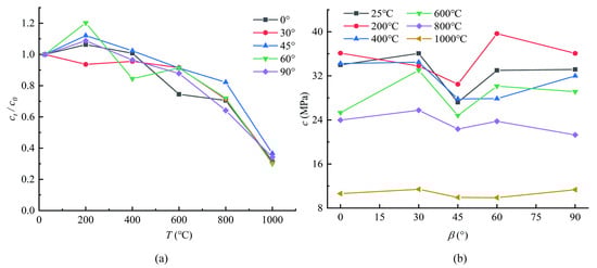 When T < 600 °C, the change trend of sandstone cohesion with bedding dip angle is relatively close; the cohesion is minimal at β = 45°, except for the sandstone at T = 200 °C, the cohesion is maximal at 60°, and the others are maximal at β = 30°. When T > 600 °C, the cohesion does not change obviously with the increasing bedding dip angle.