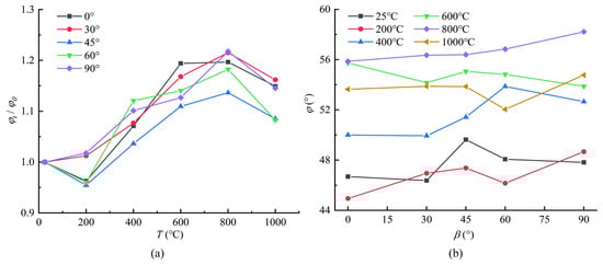 (a) φt/φ0 variation trend with temperature for rock samples with different bedding angles; (b) φ change trend with dip angle for rock samples treated at different temperatures.