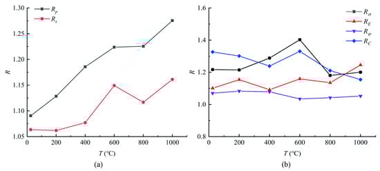 Figure 12a shows the variation law of Rp and Rs of sandstone with temperature. It can be seen from the figure that Rp increases gradually with temperature. When T = 600 °C and T = 800 °C, the anisotropy is relatively close. It can be speculated that the temperature increase has an amplification effect on the anisotropy of the sandstone’s P-wave velocity. The S-wave anisotropy degree Rs of sandstone also shows an overall increasing trend with increasing temperature, but the trend is gentler than that of the P wave. When T < 400 °C, the temperature has no obvious effect on the S-wave anisotropy of sandstone. When the temperature rises from 400 °C to 600 °C, Rs rapidly increases, but as the temperature continues to rise, Rs decreases when T = 800 °C compared with 600 °C, and the Rs of sandstone reaches the maximum value when T = 1000 °C. This shows that the temperature can amplify the anisotropy of the S-wave velocity of sandstone as a whole, but when T = 800 °C, Rs decreases more than when T = 600 °C and 1000 °C.