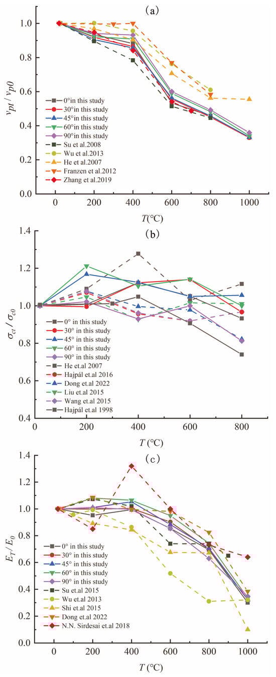 Based on a review of the available research on the changes in the physical and mechanical properties of sandstone after high temperature exposure, the test results of sandstone with different bedding angles in this paper were compared with those in other studies. Due to the limitations of physical properties such as the mass, volume, and density of sandstone after high-temperature treatment and the data of mechanical properties under triaxial conditions in the literature, we selected only the longitudinal wave velocity, uniaxial compressive strength, and elastic modulus for comparison, which was facilitated by normalizing the data.