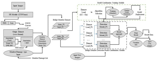 This paper proposes a deep learning framework for detecting damaged objects in bridges []. Initially, object-detection performance for each damage type is enhanced by using super-resolution (SR) techniques to improve and normalize resolution, thereby augmenting the dataset’s diversity and consistency. By using the SR technique, it is possible to build a better learning set because it maintains the quality of the images used for learning. Thereafter, we construct an optimized detection model tailored for each damage type using the bridge-damage-identification deep learning combination–module, which is based on separate training for each type. These models are then integrated into a single model and presented as an optimized solution for detecting damaged objects in bridges. The framework is specifically designed for six types of bridge damage: efflorescence, concrete scaling, concrete spalling, cracks, corrosion, and water leaks. The architecture of this framework is shown in Figure 1. The deep learning models used in combination are Mask R-CNN, BlendMask, and SWIN.