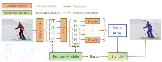 - Chen, H.; Sun, K.; Tian, Z.; Shen, C.; Huang, Y.; Yan, Y. Blendmask: Top-down meets bottom-up for instance segmentation. In Proceedings of the IEEE/CVF Conference on Computer Vision and Pattern Recognition, Seattle, WA, USA, 13–19 June 2020; pp. 8570–8578. [Google Scholar] [CrossRef]