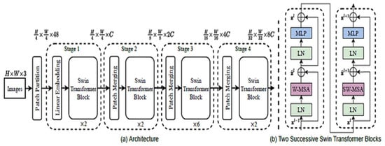 Swin Transformer (SWIN) is a model introduced in the paper “Swin Transformer: Hierarchical Vision Transformer using Shifted Windows”, developed by researchers at Microsoft Research Asia []. As shown in Figure 4, SWIN extends the existing vision transducer architecture to effectively capture the spatial structure of the image, resulting in excellent performance in tasks such as object detection and instance segmentation. The key elements of the SWIN include: