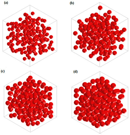 Example of generated microstuctures using different volume fractions: (a) = 10%, (b) = 15%, (c) = 20%, and (d) = 25%.