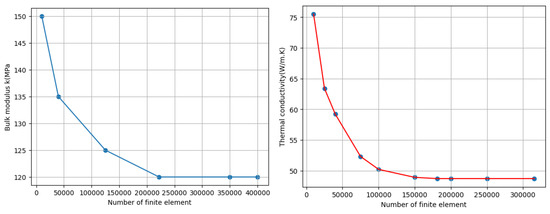 Figure 3, which illustrates the convergence of the bulk modulus and the thermal conductivity in relation to the number of finite elements used for meshing the microstructure, offers crucial insights into determining the optimal mesh density for precise simulations. The figure clearly shows that initially there is a significant decrease in the two moduli as the mesh becomes finer. This trend occurs because finer meshing, involving an increased number of finite elements, leads to a more accurate representation of the microstructure. However, beyond a certain point, as the number of finite elements continues to grow, the bulk modulus reaches a state of stabilization. This observation suggests that beyond this point, further refinement of the mesh does not contribute substantially to the improvement in accuracy.