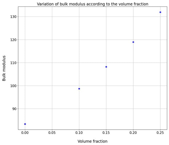 Upon examining the curve and the parameters outlined in the table, a noteworthy observation is made. The formulated equation effectively satisfies the imposed boundary conditions. Notably, when the volume fraction equals zero, the behavior of the material corresponds with that of the matrix phase. This alignment is clearly reflected in the value of , which closely approximates the known matrix bulk modulus at 83.33. This congruence demonstrates the equation’s accuracy and reliability at depicting the material’s anticipated response. It also affirms the equation’s capability to precisely represent scenarios for which the dispersed phase’s contribution is minimal or null, reinforcing the model’s validity for diverse material conditions.