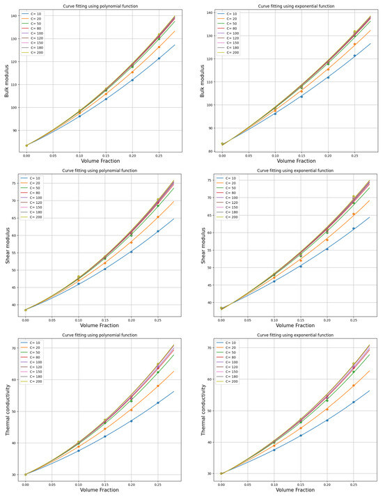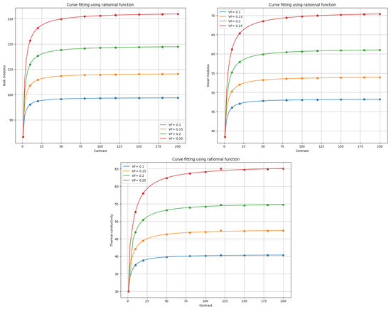 Table 2 presents the coefficients , , and for the polynomial fitting function corresponding to different contrast values. These coefficients’ values change in relation to the contrast, mirroring the variations in material behavior as the contrast increases. An in-depth examination of these coefficients provides valuable insight into the material’s characteristics and how it responds to different contrasts. Utilizing these coefficients in the fitting function enables us to predict the material’s behavior more accurately by substituting the input with a specific volume fraction.
