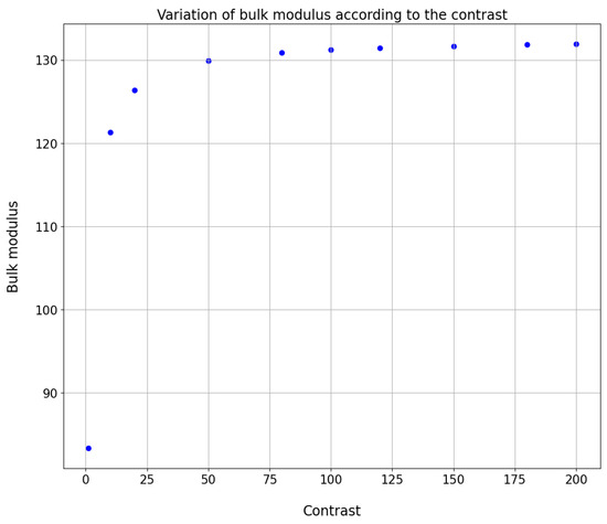 In the second phase of our study, we aim to model the various moduli as functions of contrast by maintaining a constant volumetric fraction. The analysis of the corresponding curve reveals a hyperbolic shape with a horizontal asymptote as the contrast value approaches infinity. This pattern aligns with the anticipated behavior of materials: beyond a certain contrast threshold, the material’s behavior becomes increasingly dominated by the inclusion phase. Essentially, the greater the disparity in properties between the matrix and the inclusion, the more pronounced the influence of the inclusion on the overall properties of the material. This effect is distinctly illustrated by the curve’s shape, which offers insights into the interaction between various parameters and their impact on the material’s properties. Figure 6 visually demonstrates how the bulk modulus varies in response to changes in contrast.