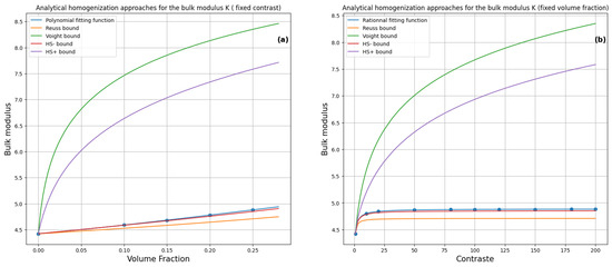 The fitting curves derived from the graphs clearly demonstrate that the effective properties of the material are accurately captured by the selected functions. The alignment of these curves within the first- and second-order Voigt–Reuss and Hashin–Shtrikman bounds is a testament to the precision of our fitting results. This not only validates the fitting process but also reinforces the reliability of the homogenization methods employed for analyzing the properties of composite materials.
