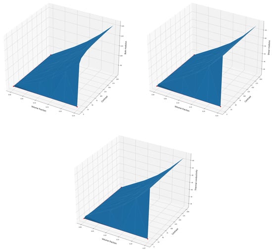Close examination of the 3D curve reveals regions where the material properties reach their highest and lowest points as functions of volume fraction and contrast. It also illustrates the global evolution of material properties when one parameter remains constant while the other varies. Consequently, this curve enhances our understanding of the interrelationships between parameters and properties in composite materials and offers valuable insights for the design and manufacturing of optimized composites.