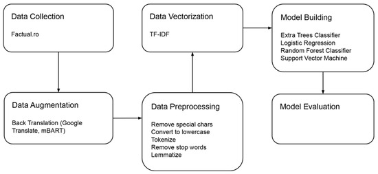 The methodology used in this study closely followed the steps of Algorithm 1. The algorithm collected data from the “Factual.ro” source. The collected data were then divided into training and test sets. The data were preprocessed by removing special characters, converting to lowercase, tokenizing, removing stop words, and lemmatizing. After preprocessing, the data were vectorized using the TF–IDF method. Data augmentation was then performed on the training set using BT. The augmented training set was preprocessed using the same preprocessing steps as the original data. The preprocessed training and test sets were used to train and evaluate a classifier. The classifier performance on the original and augmented data sets was compared to analyze the effectiveness of data augmentation.