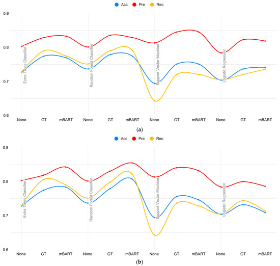 We can also observe in Figure 2 that the use of Google Translate for BT resulted in better performance compared to the original data set, but not as significant as mBART. The Extra Trees Classifier and the Random Forest Classifier performed the best, with accuracy scores of 0.7746 and 0.7793, respectively. Support Vector Machine and Logistic Regression models also showed improvements, with the latter achieving an accuracy score of 0.7324.