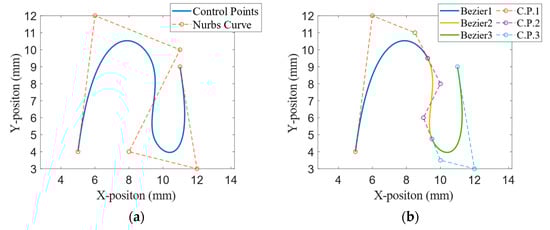 By using the knot insertion method, new control points and node vectors are created for NURBS by segmenting the NURBS curve into several Bezier curves. Table 1 includes the NURBS control points and knot vectors assigned in this study, and the results of the initial segmentation can be found in Figure 1.
