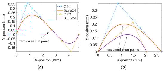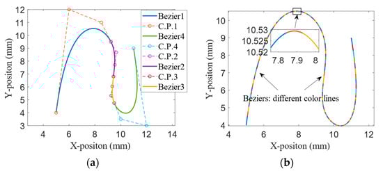 Finally, according to the set chord error , the new Bezier curves are continuously segmented into halves until the chord error of all Bezier curves meet the requirement. Figure 3 shows the second segmentation and subsequent iterative segmentation results. Details can be found in Algorithm 1.