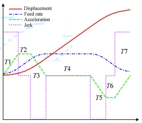In this section, we introduce the double S-shaped feed rate profile briefly. The S-shaped ACC/DEC profile, which consists of seven phases (T1, T2, T3, T4, T5, T6, T7), is shown in Figure 4.