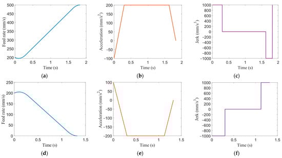 Schematic diagram of dynamic speed control planning. Acceleration control case: (a) feed rate curve; (b) acceleration curve; (c) jerk curve; deceleration control case: (d) feed rate curve; (e) acceleration curve; (f) jerk curve.