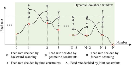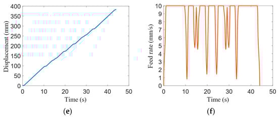 To address this issue, a feed rate bisection method was introduced in [] to search for the feasible feed rate . While this method resolves the problem of dynamic lookahead planning failure, it significantly reduces execution efficiency. Whenever the aforementioned condition occurs, the bisection method is invoked to search for the feasible feed rate between and . However, in this paper, an adaptive S-shaped method is adopted, which allows for dynamic adjustment of the boundary feed rate based on the relationship between arc length and feed rate. By employing this adaptive S-shaped method, the optimal feed rate profile can be directly obtained. Consequently, by initiating the forward scanning anew based on the current situation, the execution efficiency of the actual program is improved.