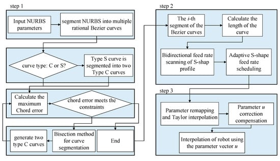 Industrial robot machining systems not only have weak stiffness characteristics compared to traditional numerical control (CNC) machining systems, but also have constraints on tool path chord error and nonlinear kinematic mapping issues. These are the main factors that affect machining quality and trajectory accuracy. The purpose of robot body control and compensation is to reduce the influence of joint weak stiffness on trajectories, while the purpose of industrial robot interpolation systems is to improve the accuracy and efficiency of trajectories. Therefore, the adjustment of the feed rate in the industrial robot curve parameter interpolation system plays a key role in the high-speed and high-precision machining of molds, aerospace parts, and other applications []. Smooth trajectories can help robots avoid sudden load changes, extend the life of joints, and improve position control accuracy. On the other hand, discontinuous feed rates can cause vibrations in the mechanical structure and servo control system, thereby reducing contour accuracy, affecting trajectory accuracy, and leading to task failures or even accidents []. Therefore, the research on high-precision trajectory planning and interpolation systems for industrial robots is of great significance. In order to achieve high-speed and high-precision machining, many scholars have devoted themselves to studying techniques such as parameter curve segmentation, feed speed contour adjustment, and parameter curve interpolation. Traditional flat paths typically use a large number of short line segments instead of the entire curve, which inevitably leads to discontinuous tangent directions and abrupt changes in curvature, resulting in a decrease in feed rate. Due to the lack of G1 and G2 continuity at the junctions of adjacent line segments, rate fluctuations and changes in acceleration often occur. Nonuniform rational B-spline (NURBS) parameter curves have effectively addressed the above problems [] and have become the standard format for free-form curves and surfaces.