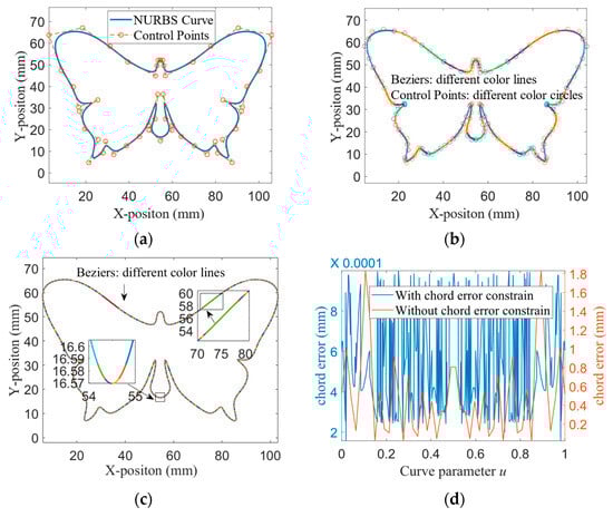 In this section, simulations are conducted to show the effectiveness of the proposed method. The computer utilized has a CPU: I7-11800H-2.30 GHz (Intel Corporation, Santa Clara, CA, USA), 64 G-3200 MHZ memory, and the MATLAB (The MathWorks, Natick, MA, USA) version is 2022b. The plane butterfly NURBS curve (see Figure 10a) is employed as the test subject for algorithm evaluation. The chord error is set as 0.001 mm. Figure 10b shows the butterfly curve segmented into a type-C curve by the zero curvature point, and Figure 10c shows the butterfly curve segmented into 1579 type-C curves that satisfy 0.001 mm. Each Bezier curve is distinguished by color. In Figure 10d, with the chord error, the chord value is less than 0.001 mm, while the chord is a hundred times higher when without chord error control. In Figure 10e,f, respectively, the displacement and feed rate of the bidirectional feed rate scanning of the S-shaped profile are shown. Based on these figures, the plant area always has a longer Bezier curve, while the peak part has a shorter curve, which makes sense.