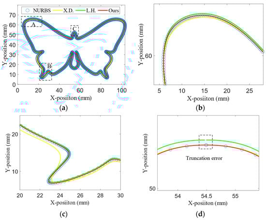 Figure 11 illustrates the results of the segmentation and interpolation of NURBS using different methods. From Figure 11b,c, it can be observed that X.D. is subject to an open-loop chord error constraint, leading to significant trajectory deviation. L.H. involves altering control points to ensure chord error constraint, but such modifications result in trajectory displacement. Figure 11d presents truncation error, indicating that without closed-loop Taylor interpolation, the curve is influenced by cumulative interpolation and Taylor expansion truncation error, preventing closure. In contrast, the proposed method in this paper ensures trajectory accuracy while eliminating cumulative interpolation errors, resulting in an unbiased trajectory.