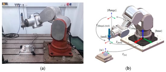 To demonstrate the proposed method, an experiment was conducted on a 6-DoF industrial robot. The robot machining system is shown in Figure 12. A complete robot system typically comprises three frames: the base frame, the tool frame, and the workpiece frame. The workpiece frame {w} is exclusively associated with the machining process and is unrelated to calibration. The base frame {base} is typically fixed beneath the first joint of the robot, serving as the primary reference system. The tool frame {tool} is located at the end of the robot.