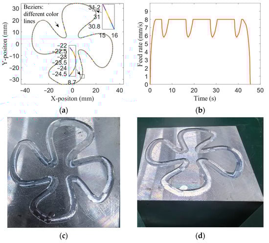 The controller’s hardware platform is equipped with the SpeedGoat RCP (The SpeedGoat, Bern, Switzerland) real-time simulation platform, featuring a computation cycle of 1 ms. The control system is developed using the MDH model and leverages the real-time functionality of MATLAB Simulink (The MathWorks, Natick, MA, USA). The computer utilized has a CPU: I7-11800H-2.30 GHz (Intel Corporation, Santa Clara, CA, USA), 64 G-3200 MHZ memory, and the MATLAB version is 2022b. In Figure 13a, the fan curve segmentation result is presented, employing the chord error constraint method with 1454 segments, and the maximum chord error is 0.001 mm. Figure 13b displays the bidirectional feed rate scanning of the S-shaped profile. The surface of the fan NURBS curve is shown in Figure 13c,d. It can be observed from the figures that the machining surface obtained by the proposed method exhibits no obvious overcutting, indicating a relatively smooth surface quality.