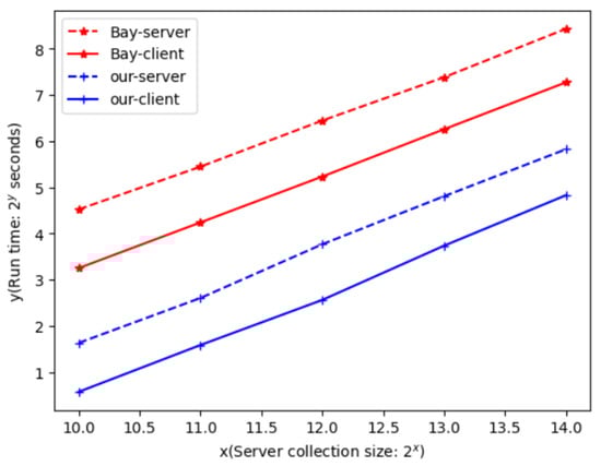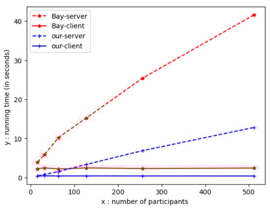 We fixed the size of clients’ datasets at and the number of participants at . Additionally, we increased the size of the server’s set from to for the experiment to test the runtime of the clients and the server. The experimental results are shown in Table 4 and Figure 3. It can be seen that the client–server runtime of both our protocol and [28] was linearly related to the size of the server dataset. But, our protocol had a significant improvement in efficiency compared to the protocol of Bay et al. [28], and the runtimes of the server and clients were approximately of [28].