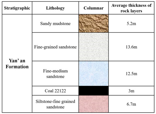 The 22,122 working face is located in the No. 1 mining area, spanning 835.5 m in length and 340.9 m in width, covering a total area of 284,821.95 m2. The coal seam varies in thickness from 2.14 m to 4.81 m, with an average thickness of 2.93 m. The roof of the working face consists mainly of sandy mudstone and siltstone, followed by mudstone and medium-grained sandstone, with localized occurrences of fine-grained sandstone and coarse-grained sandstone. The floor primarily consists of siltstone and fine-grained sandstone. The stratigraphic column of the working face is shown in Figure 1. In the auxiliary haulage roadway of the 22,122 area, the roof consists mainly of continuous medium-grained sandstone, with good rock layer integrity and reduced susceptibility to collapse during mining operations. However, there is a significant issue of air leakage at the two corners of the working face. Currently, measures such as wind curtains and cement bag walls are primarily used to mitigate air leakage. The 22 coal seam is characterized by its overall black coloration with black-brown streaks. The primary constituents of the coal rock include dark coal, bright coal, and some occurrences of cannel coal and vitrinite. The coal exhibits an asphalt luster, featuring a uniform and banded structure, blocky texture, extensive crack development, semi-hardness, and a propensity for spontaneous combustion. The coal seam has a natural ignition period of 42 days, with flame lengths exceeding 400 mm, and the coal dust within the seam possesses explosive properties.