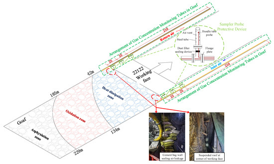 To fully grasp the impact of corner filling on changes in the gas concentration in the goaf, the oxygen concentration in the goaf is monitored using a 260 m long 2-inch seamless steel pipe. This pipe is positioned in the direction of the main withdrawal channel, starting from the end position of the inlet and return air lane of the 22,122 working face. By employing the oxygen concentration method, the approximate range of the oxidation zone in the goaf is determined. This method relies on measuring the oxygen concentration at various distances from the goaf to the working face. Areas with an oxygen concentration greater than 15% are classified as heat dissipation zones. Areas with an oxygen concentration between 15% and 5% are considered oxidation spontaneous combustion zones. Lastly, areas with an oxygen concentration below 5% are identified as asphyxiation zones. Sampling probes are strategically placed at 25 m intervals, starting from the corner of the working face. Each intake and return airway has three probes, labeled as “Inlet 1,” “Inlet 2,” “Inlet 2,” “Return 1,” “Return 2,” and “Return 3”. To protect the probes from damage, probe protection devices are utilized, and seamless steel pipes are connected using flange plates to ensure strong connections. Through sampling and an analysis of gas concentration data, it is observed that, on the intake side of the 22,122 working face, the oxygen concentration decreases to below 15% at a distance of 134 m from the working face, indicating entry into the oxidation zone. At a distance of 229 m, the oxygen concentration further decreases to below 5%, signifying entry into the asphyxiation zone. The oxidation zone is approximately 95 m wide. On the return side of the goaf, the oxygen concentration decreases to below 15% at a distance of 42 m from the working face, entering the oxidation zone. At a distance of 185 m, the oxygen concentration drops below 5%, indicating entry into the asphyxiation zone. The oxidation zone on the return side has a width of around 141 m. Figure 2 illustrates the situation of the 22,122 working face and the distribution diagram of the “three zones” of spontaneous combustion in the goaf.