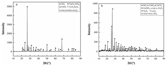 X-ray diffraction analysis results of filling materials: (a) mountain sand; (b) fly ash.