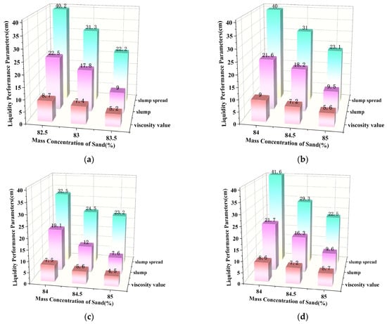 Based on the physicochemical properties of the mountain sand-based paste filling material, various mix ratios (cement: fly ash: mountain sand) and mass concentrations of the mountain sand-based paste were prepared. Slump, slump spread, and viscosity tests were carried out on slurries with different ratios using a slump cone and an SC145 mortar viscometer. The test results, depicted in Figure 4, indicate a decrease in the slump, slump spread, and viscosity values of the mountain sand-based filling slurry with an increase in the mass concentration. Using a slump range of 16 to 20 cm as the standard, the optimal concentration for the 1:2:6 mountain sand ratio is 83%, with a slump of 17.8 cm; for the 1:2:10 ratio, the optimal concentration is 84.5%, with a slump of 18.2 cm; for the 1:4:15 ratio, the optimal concentration is 84%, with a slump of 19.1 cm; and for the 1:4:20 ratio, the optimal concentration is 84.5%, with a slump of 16.3 cm.