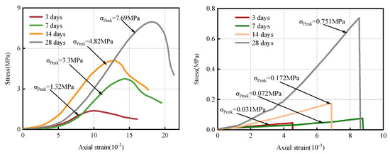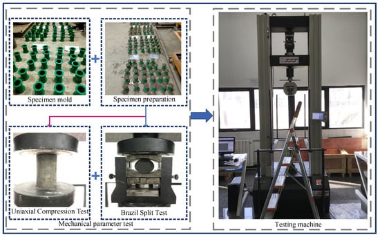 Based on the aforementioned test results, a strength test was performed on the sand-based paste filling material using a selected mixing ratio of 1:4:15, a mass concentration of 84%, a dosage of 9% of the J85 rapid-setting agent, and a dosage of 0.5% of the UEA-type expansion agent. A total of eight sets of cylindrical filling specimens, measuring 50 mm × 100 mm, were prepared, with three specimens in each set. The compressive strength and tensile strength of the specimens were measured at curing ages of 3 days, 7 days, 14 days, and 28 days to analyze the variation in the strength characteristics of the paste filling material [31,32]. The testing process is shown in Figure 6. The test results are presented in Figure 7.