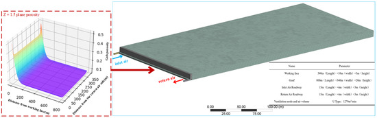 Based on the geological conditions of the 22,122 working face and considering the distribution law of the fragmentation coefficient, a fitting process was conducted to obtain a porosity distribution map of the goaf with Z = 1.5 for the 22,122 working face using Python-3.9.6. The porosity, permeability, gas flow, and dissipation coefficient of the goaf were then imported into Fluent for solving using UDF functions. The resulting goaf model is illustrated in Figure 8.
