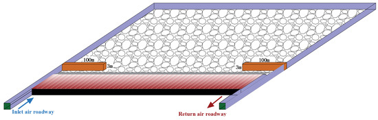 To evaluate the impact of different corner fillings on goaf air leakage and the extent of the oxidation zone, we introduced pre-set filling bodies behind the working face, expanding on the model established in the previous section. We examined three distinct scenarios: C1—filling only the upper corner of the working face, C2—filling only the lower corner of the working face, and C3—filling both corners. The pre-set filling bodies were 100 m long, 3 m wide, and 3 m high, with an approximate zero porosity. The ventilation parameters remained consistent with the conditions outlined in the previous study. The specific layout is shown in Figure 10.