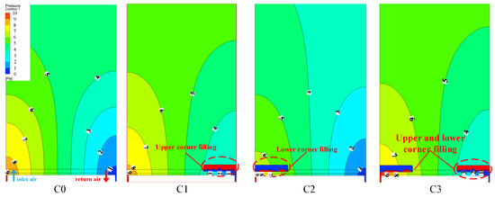 After comparing the unfilled and only partially filled lower corner areas, it becomes evident that filling the lower corner leads to the dominance of the deep goaf by pressure isopleths of 3–4 Pa in the blue area. Furthermore, the high-pressure range significantly decreases, resulting in a decline in pressure within the deep goaf. Consequently, an increased pressure difference between the lower corner and the deep goaf occurs. Fortunately, the filling material in the lower corner effectively obstructs the majority of airflow from infiltrating the goaf. Simultaneously, the reduced pressure difference between the upper corner and the deep goaf hampers the backflow of harmful gases into the working face, thereby reducing the accumulation of gas in the upper corner of the goaf.