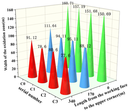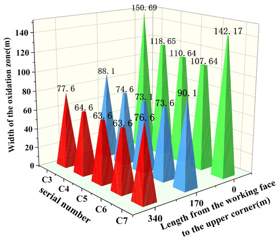 Figure 16 presents a schematic diagram demonstrating the extent of the oxidation zone in the goaf at various interval distances of filling bodies. It is evident from the figure that an increase in the interval distance, from primary filling to intervals of 10 m, 30 m, and 50 m, leads to a decrease in the average width of the oxidation zone within the goaf. Interestingly, at an interval distance of 50 m, the oxidation zone width in different parts of the goaf is the smallest. However, as the interval distance is further increased to 70 m, the measured width of the oxidation zone in the goaf exceeds that observed at 10 m, 30 m, and 50 m distances. In fact, in the central section of the goaf, the width of the oxidation zone even surpasses that of the primary filling condition. This indicates that excessively large interval distances between filling bodies have limited effects on reducing the width of the oxidation zone in the goaf. Therefore, it is important to establish a reasonable interval distance for filling to effectively control the width of the oxidation zone in the goaf.