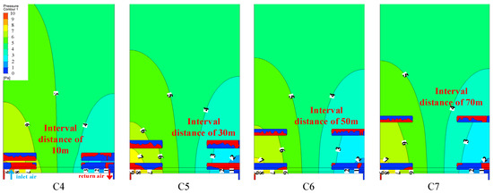 Figure 14 displays the pressure distribution in the goaf on the z = 1.5 m plane with varying intervals between the filling bodies. It is evident from Figure 14 that an increase in the interval distance between the filling bodies results in a reduction in pressure in the deeper parts of the goaf. Specifically, with interval distances of 10 m, 30 m, and 50 m, the green range of the pressure contour lines (5–6 Pa) gradually diminishes, while the blue range (3–4 Pa) progressively expands. Additionally, when the interval distance reaches 50 m, the two pressure ranges become nearly identical, indicating a relatively balanced pressure field in the goaf. However, with an interval distance of 70 m, the expanded interval distance significantly increases the blue pressure zone of 2–3 Pa, amplifying the pressure difference between the return air side and the lower corner angle of the goaf and resulting in a greater influx of air leakage into the goaf. Furthermore, the presence of the two filling bodies on the return air side obstructs the movement of air leakage, causing its accumulation between the two filling bodies and adversely impacting the reduction in the width of the oxidation zone on the return air side.